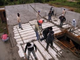 Durante toda la mañana del miércoles, la lluvia no paró ni un instante en la Ciudad de Resistencia, sin embargo a las 14 horas y cuando el cielo pudo aclararse un poco y la calma de una tenue llovizna humedecía el encofrado de la gran losa, los colaboradores de Ciudad Limpia, operarios de la Empresa de Juan Alberto García y un grupo de piqueteros del MTD 17 de Julio que conduce el líder social Tito López empezaron a volcar el hormigón que traían los camiones de la Empresa Melmix y lo depositaban en la gran superficie de viguetas y losas llenas donde Hierros Linder también volvió a colaborar.