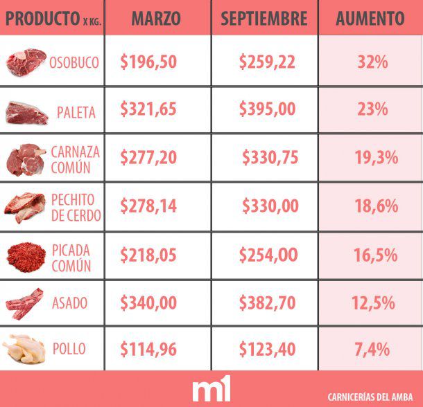 Así, el osobuco pasó de valer 196 pesos en marzo a 260 pesos en septiembre, un alza del 32%. Le sigue la paleta con 23% de aumento, un corte muy demandado en cuarentena por su precio bajo y porque la gente está más tiempo en la casa y realiza comidas con mayor rendimiento de porciones como guisos, pucheros y estofados.