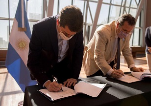 El ministro del Interior, Wado de Pedro, y su par de Cultura, Tristán Bauer, firmaron hoy en el Centro Cultural Kirchner un convenio de colaboración para desarrollar iniciativas culturales y proyectos de divulgación conjuntos, en el marco el marco del Bicentenario del Archivo General de la Nación (AGN).
