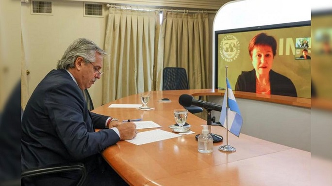El presidente Alberto Fernández dialogó esta mañana, por videoconferencia y desde la residencia de Olivos, con la directora gerente del Fondo Monetario Internacional (FMI), Kristalina Georgieva, en la que discutieron la situación internacional de Argentina y la continuidad de las negociaciones, a horas de la asunción de Joe Biden.