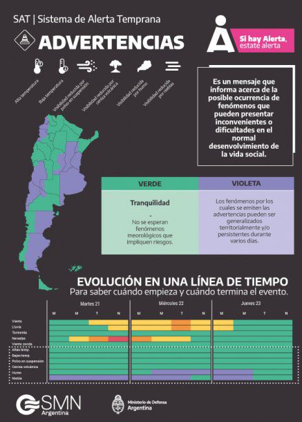 En tanto, para la Ciudad y las provincias de Buenos Aires, Córdoba, Entre Ríos, La Pampa, La Rioja, Mendoza, San Juan, San Luis y Santa Fe rige el "alerta violeta".