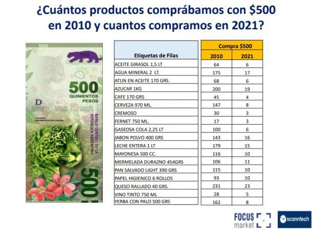 Para eso seleccionó 23 productos de consumo masivo y comparó que cantidad de cada uno de ellos podía comprarse con 500 pesos en 2010 y cuántos hoy.