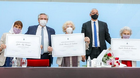 En las vísperas del Día de la Memoria por la Verdad y la Justicia, el presidente Alberto Fernández encabezó este martes la entrega de los premios Juana Azurduy a las integrantes de Madres y Abuelas de Plaza, donde calificó a esas mujeres como "inmensas", y destacó como tarea fundamental "hacer docencia" sobre la historia del golpe militar que interrumpió la vida democrática argentina el 24 de marzo de 1976.