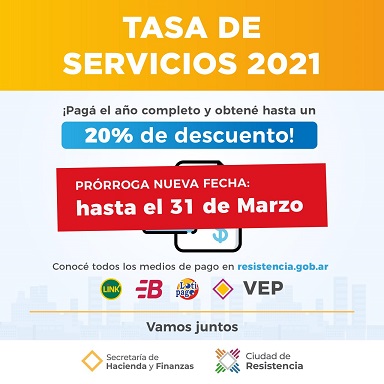 Resistencia informa que el próximo miércoles 31 de marzo caduca la extensión de los beneficios por la realización del pago anual anticipado de tasa de servicios, los cuales incluyen hasta un 20% de descuento.
