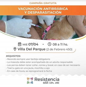 La campaña de vacunación antirrábica y desparasitación gratuita de perros y gatos, que lleva adelante Resistencia, continuará este miércoles 7 de abril, de 8 a 11, en el Centro Comunitario Municipal de Villa del Parque, ubicado en calle 2 de Febrero 450.