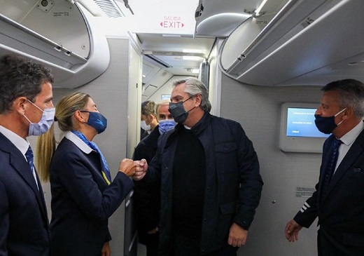 La comitiva que acompaña al mandatario en un vuelo de Aerolíneas Argentinas está conformada por la primera dama, Fabiola Yañez; el canciller Felipe Solá; el ministro de Economía, Martín Guzmán; el secretario General de la Presidencia, Julio Vitobello; el secretario de Asuntos Estratégicos, Gustavo Beliz; y el secretario de Comunicación y Prensa, Juan Pablo Biondi.