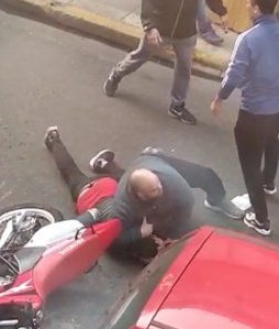 Un grupo de vecinos persiguió y atrapó este viernes a dos motochorros luego de que le robaran su celular y dinero, en la esquina de las calles Bolívar y Rosales, Ramos Mejía, partido bonaerense de La Matanza. Le dieron una brutal golpiza y los retuvieron hasta que la Policía llegó al lugar y los detuvo. El violento episodio quedó registrado por uno de los vecinos y se viralizó.
