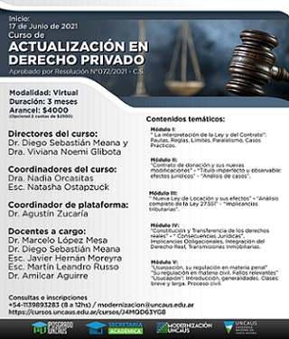 En el cursado se tratarán temas actuales e importantes de derecho privado, como son la nueva ley de alquileres, donaciones, usucapión, propiciando el estudio de las normas, relacionándolas directamente con casos para la adquisición de habilidades de manejo de modo correcto, teniendo en cuenta los problemas que diariamente deben enfrentar los profesionales y resolver los Magistrados. Conocer y profundizar los principios y normas vigentes, jurisprudencia nacional e internacional, vistos desde la realidad que será filtrada con las normas, obteniendo así riqueza educativa, al proyectar soluciones para los casos.