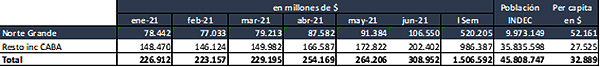 A su vez los ingresos del Norte Grande para el I Semestre 2021 ($ 520.205 millones) son el 34,5 % de los ingresos automáticos totales que fueran distribuidos en concepto de Coparticipación Federal de Impuestos y Regímenes Especiales. Las restantes 13 provincias y la CABA en conjunto percibieron el 65,5% ($ 986.387 millones).