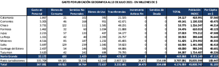 Para el caso particular de las provincias integrantes del Norte Grande, mientras que la jurisdicción del Chaco es la que percibe nominalmente los mayores ingresos automáticos ($ 72.152 millones), la de La Rioja es quien menos ($ 29.788 millones). Sin embargo, si analizamos el ingreso per cápita para el primer semestre 2021, mientras que en Catamarca fue de $ 94.076, en Misiones solo de $ 37.784.