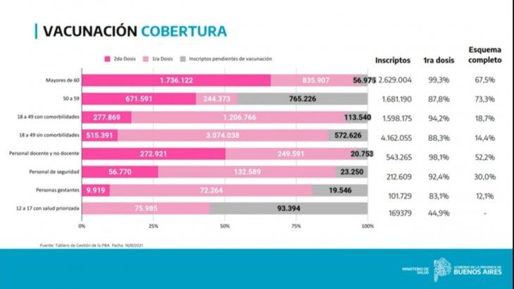 En tanto, todos los mayores de 18 años cuentan con la posibilidad de acceder a la denominada "vacunación libre", es decir, dirigirse sin turno a cualquiera de los 400 puntos donde se aplican las vacunas contra el coronavirus, sólo con DNI que acredite domicilio en la provincia, y recibir su primera dosis.