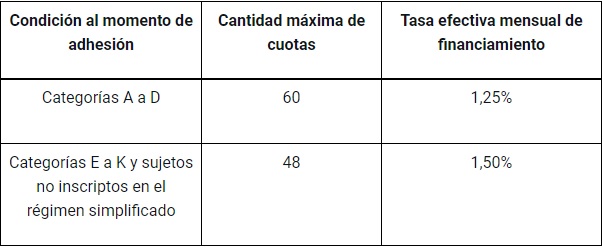 La cantidad máxima de cuotas y la tasa de financiamiento a acceder dependerá de la categoría de las y los monotributistas: