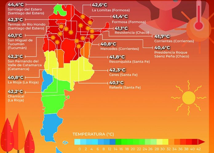 Al mediodía gran parte del país permaneció “dentro de los valores de ola de calor, con temperaturas en torno a los 41 y 42 grados” a pesar de las lluvias registradas en el centro del país y el ingreso de aire frío a la atmósfera.