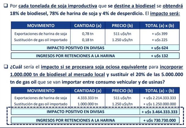 “Más biodiésel, mejor para la capacidad productiva, que hoy está muy escasa”, sostiene Pucciarello. Actualmente, el corte obligatorio de refinamiento es del 5% del gasoil, a lo cual se le agregará un 10% en su posibilidad de refinación, que hoy las petroleras no tienen, lo cual implicaría un ahorro de 1.500 millones de dólares. “El biodiésel se produce y se consume en pesos. Al gasoil hay que importarlo en dólares, y esos dólares hay que sacarlos de la economía real” explicó Pucciarello el ahorro.
