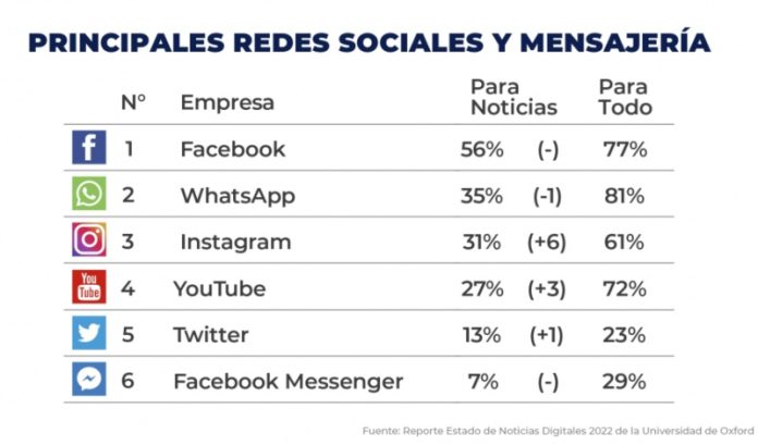 En particular, las plataformas más usadas para acceder a las noticias son propiedad de Meta: Facebook (56%), WhatsApp (35%) e Instagram (31%), las cuales encabezan el ránking y evidencian así el poder dominante del grupo corporativo de Mark Zuckerberg.