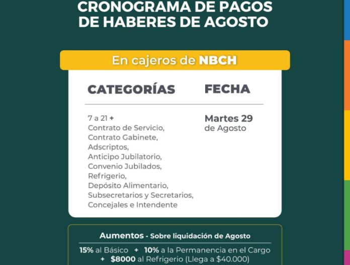 El cronograma establecido es para las categorías 7 a 21, depósito alimentario, contratados de Gabinete y de Servicios, anticipo jubilatorio, convenio jubilados, depósito judicial, adscriptos, secretarios y subsecretarios, concejales e intendente.