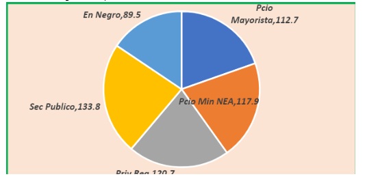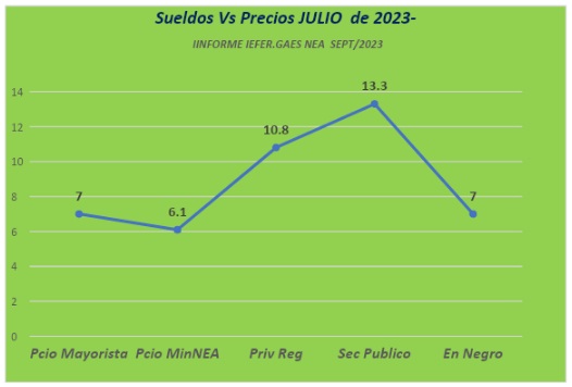 Durante el mes de julio de 2023 el nivel de precios minorista del NEA ascendió al 6,1% en tanto que el ajuste salarial a nivel nacional del sector privado fue del 10,8%, el sector público aumentó el 13,3% promedio, en tanto que el de menor incremento fue el sector de empleados en negro que tuvo una variación del 7%