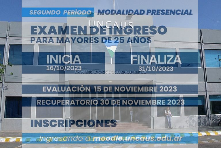 La Universidad Nacional del Chaco Austral (UNCAUS) a través de Secretaría Académica, informa que se encuentran abiertas las inscripciones, hasta el 31 de octubre de 2023, para aquellas personas mayores de 25 años que no poseen título de nivel secundario y que deseen estudiar una carrera presencial o a distancia en la institución, en el Ciclo Lectivo 2024. Las evaluaciones se realizarán el 15 de noviembre de 2023 y los recuperatorios el 30 de noviembre de 2023.
