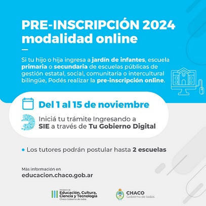 El Ministerio de Educación, Cultura, Ciencia y Tecnología del Chaco recuerda que el período de preinscripción para el ingreso a los niveles Inicial, Primario y Secundario 2024 de todas las unidades educativas públicas de gestión estatal, social y comunitaria, se realizará del 1 al 15 de noviembre. Al igual que en los últimos dos años, será de manera virtual a través del Sistema Integral de Educación (SIE) de la provincia, dispuesto por medio de la Resolución Nº 746/21 y las modificatorias establecidas por la Resolución Nº 4221/2022.