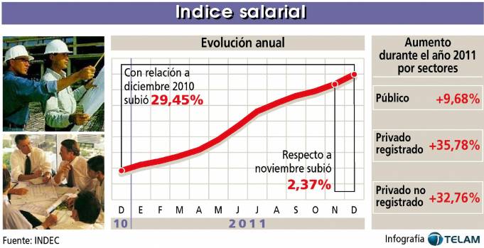 Estos niveles de incremento en el 2011 se lograron luego de que en diciembre se anotaran alzas del 3,13% en los ingresos de los trabajadores privados registrados, del 2,28% en los no registrados, y del 0,05% en los empleados públicos.