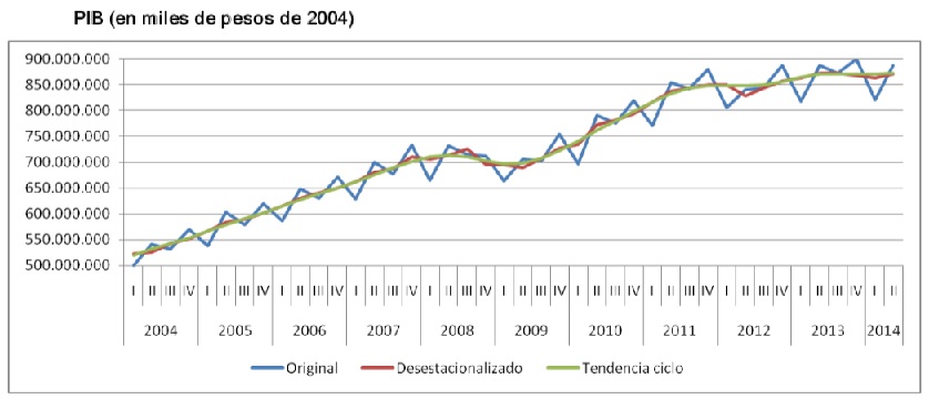 En particular, el Valor Agregado a precios básicos durante el segundo trimestre de 2014 presentó un crecimiento respecto a igual período del año anterior del 0, 3%. , en tanto que el PIB desestacionalizado del segundo trimestre de 2014 con respecto al primer trimestre del 2014 arroja una variación de 0,9 %