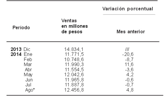 Las ventas a precios corrientes comprendidas en la encuesta sumaron $15.689,4 millones, lo cual representa una suba de 37,9% respecto al mismo mes del año anterior. La variación interanual de las ventas de los primeros ocho meses del año 2014 fue de 37,6