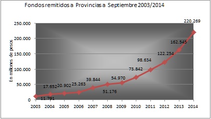 En el caso de las provincias en su conjunto podemos observar el crecimiento constante en estos últimos años y se presenta en el siguiente gráfico donde se detallan los fondos acumulados desde enero a septiembre del año 2003 hasta el año 2014