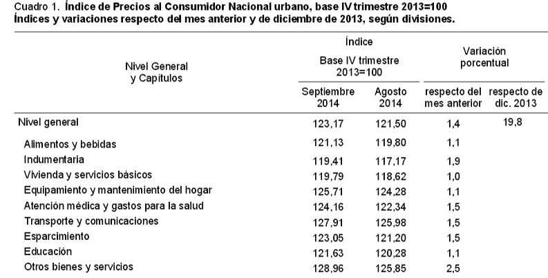 Esta medición del Nivel General del Índice de Precios al Consumidor Nacional urbano registró en septiembre una variación de 1,4% con relación al mes anterior. Con respecto a diciembre de 2013, el Nivel General tuvo una variación de 19,8%.