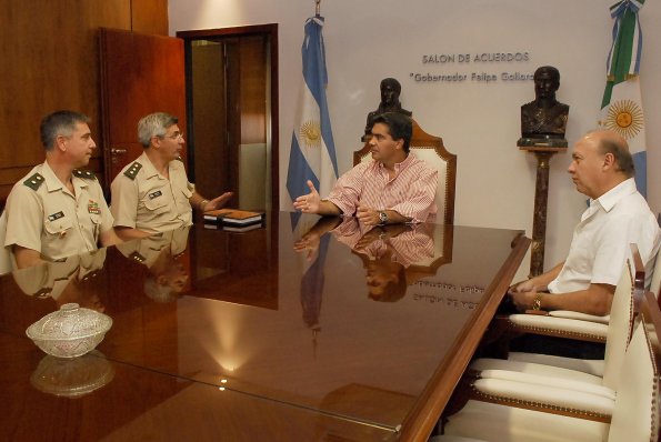 El gobernador Jorge Capitanich recibió en la tarde de este martes al nuevo Jefe de la Compañía de Inteligencia del Ejército Argentino, el Teniente Coronel Rafael Milillo y al Jefe de la Guarnición Resistencia, Coronel Rafael Guerrero, para delinear la puesta en marcha del convenio marco de cooperación y colaboración mutua que el Gobierno provincial firmó en diciembre con la Dirección General de Inteligencia del Ejército Argentino. Y que apunta a trabajar conjuntamente en la actualización del Sistemas de Información Geográfica del Ejercito Argentino (SIGEA).