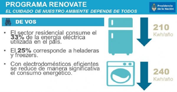 La presidenta Cristina Kirchner anunció este jueves "Renovate", un plan de canje de lavarropas y heladeras usadas por otras nuevas, que podrán adquirirse en cuatro cadenas de electrodomésticos: Frávega, Musimundo, Garbarino y Rodó. Los comercios ofrecerán descuentos del 25 por ciento de lunes a viernes; y los sábados y domingos se podrá además financiar en 12 cuotas sin interés en el marco del programa Ahora 12.