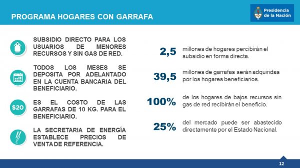 En el caso de los subsidios para garrafas. La nueva iniciativa que se llama Hog.AR (garrafa) reemplazará el actual sistema de garrafa social y dará un subsidio directo a los usuarios de menores recursos a través de una transferencia monetaria. Es decir se demanda al usuario y no al proveedor. Habrá a 2,5 millones de beneficiarios o 40 millones de garrafas.