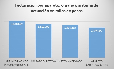 Respecto a la facturación por aparato , órgano o sistema sobre el que actúa el medicamente, podemos mencionar que durante el primer trimestre de 2015 los medicamentos de mayor facturación fueron los medicamentos antineoplásicos e inmunomoduladores con 1.648.659 miles de pesos (representando un 16% del total facturado), seguidos por los destinados al aparato digestivo con 1.513.393 miles de pesos (14,7%), los destinados al sistema nervioso con 1.473.615 miles de pesos (14,3%) y los destinados al aparato cardiovascular con 1.344.877 miles de pesos (13%).