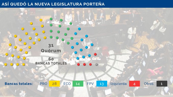 En rigor, la Legislatura porteña cuenta con 60 diputados, de los cuales unos 30 terminarán su mandato en diciembre próximo, cuando cambiará su conformación a partir de los resultados obtenidos en las elecciones generales, donde fueron seis las listas que compitieron: PRO, ECO, FpV, FIT, AyL y Camino Popular. El candidato del macrismo, Horacio Rodríguez Larreta, obtuvo el 45,51 por ciento de los votos y deberá disputar el balotaje con su rival de ECO, Martín Lousteau. Gracias a ese porcentaje, el PRO obtuvo 15 bancas.