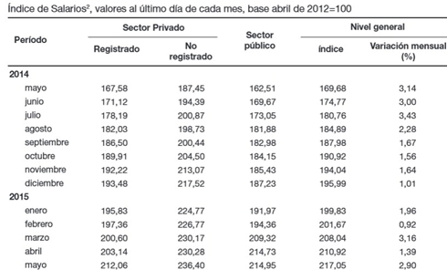 El INDEC informó sobre la evolución del índice de salarios pagados en la economía durante el mes de mayo de 2015 y su comparación inter anual y mensual respecto de abril de 2015 , en esta medición se realizan estimaciones sobre tres sectores: el sector privado registrado, el privado no registrado y el sector público.