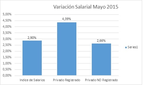 Variación salarial mes de mayo de 2015Al realizar el análisis de la variación del salario, se efectúa en primer lugar la comparación del nivel general salarial y luego se trabaja sobre tres sectores claramente definidos, por un lado el sector privado, en sus dos modalidades, el registrado y el NO registrado, y por otro el sector público.