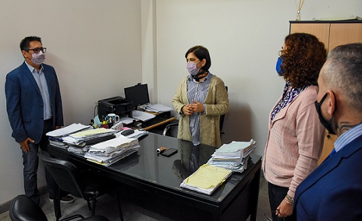 Locales | Como lo viene haciendo con cada área, Gustavo visitó las oficinas de los Juzgados de Faltas municipal 1 y 2, ubicadas en Saavedra 420, donde respetando los protocolos sanitarios dialogó con las juezas Matilde Campias, Viviana Leyes Álvarez, y los trabajadores del sector, sobre el funcionamiento de la metodología de trabajo que se desarrolla por la pandemia.