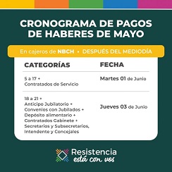 Locales | Resistencia informa que a partir de este martes 1 de junio iniciará el pago de sueldos de los empleados municipales, correspondiente al mes de mayo, los cuales serán depositados en las cuentas del Nuevo Banco del Chaco (NBCH).