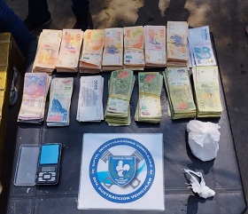 Se incautaron elementos de interés en la causa investigada, más de 200 gramos de cocaína, casi un millón de pesos, cartuchos y una réplica de arma de fuego.