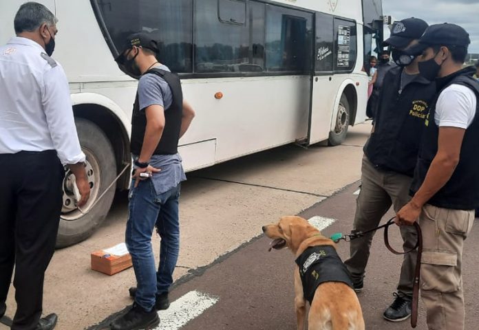 Locales | Agentes de Inteligencia de Drogas y de la División Drogas La Leonesa, detuvieron el recorrido del ómnibus frente a la entrada de Puerto Tirol. El can Balton detecto la mercancía dentro de una caja de zapatos, la que registró más de dos kilos de cannabis sativa; los que fueron incautados por el personal policial de la Dirección General de Consumos Problemáticos.