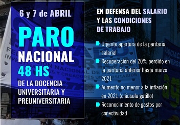 Locales | El Plenario de Secretarías Generales de nuestra Federación CONADU Histórica, que se reunió de manera virtual el 26 de marzo de 2021, definió convocar a un Paro Nacional de 48 horas para los días 6 y 7 de abril próximos.