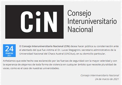 Locales | En el día de la fecha el Consejo Interuniversitario Nacional (CIN) emitió una declaración ante el atentado sufrido por el secretario administrativo de Uncaus.