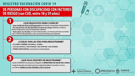 Locales | Para personas con discapacidad con factores de riesgo, de entre 18 y 59 años, que cuenten con el Certificado Único de Discapacidad (CUD). El registro se realiza de lunes a viernes, de 8 a 16, a través de llamada telefónica (3624-749224/ 749102/ 338600) o formulario digital (https://forms.gle/8v2VdeaBPNVtLtXY9).