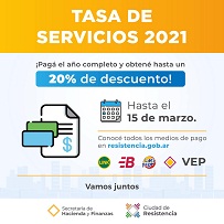 Locales | La Ciudad de Resistencia informa a sus vecinos y vecinas que está disponible hasta el lunes 15 de marzo la posibilidad de acogerse al pago anual anticipado de Tasa de Servicios 2021, que estipula un descuento de hasta el 20%.