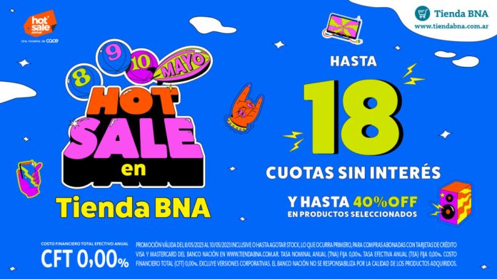 Nacionales | El Banco Nación, a través de su plataforma Tienda BNA, ofrecerá hasta 18 cuotas sin interés y descuentos de hasta 40% en productos seleccionados con sus tarjetas, como parte de la décima edición del evento de ventas online Hot Sale entre el lunes y el miércoles próximo.