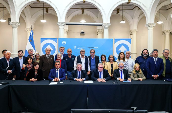 Nacionales | El presidente Alberto Fernández anunció este viernes, junto a los ministros de Educación, Jaime Perczyk, y de Economía, Sergio Massa, y la ministra de Trabajo, Raquel Olmos, el acuerdo con los gremios docentes para aumentar el salario de las y los ma
