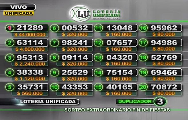 Nacionales | El Sorteo Extraordinario de Fin de Fiestas, de la Lotería Unificada, tuvo lugar este sábado a las 22 desde la Sala de Sorteos de la Lotería Neuquina. El primer premio, de 22 millones de pesos y 44 millones con duplicador, correspondió al número 21.289, asignado a las provincias de Chaco y Neuquén. En tanto el duplicador correspondió al número 3. En total, se repartieron más de 1280 millones de pesos en premios.