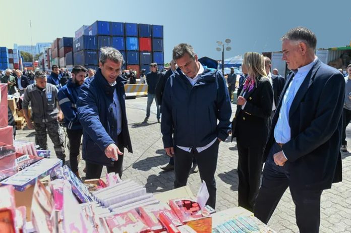 Nacionales | El ministro de Economía, Sergio Massa anunció el decomiso de 14 contenedores cargados con mercadería de contrabando y de fraude marcario proveniente de China. El valor de los productos asciende a 5,6 millones de dólares, con un monto promedio de 400.000 dólares por contenedor. En un breve mensaje a los medios, pidió "mandar presos" a los que intentan "robarse" los dólares de las reservas y agregó: "se terminó el festival de importaciones".