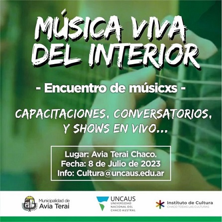 Locales | El sábado 8 de julio, desde las 9, en la localidad de Avia Terai se realizará el encuentro “Música viva del interior”. Se trata del primer encuentro de músicos del interior chaqueño, que incluirá conversatorios, capacitaciones y shows en vivo. Todas las actividades durante el encuentro serán gratuitas.