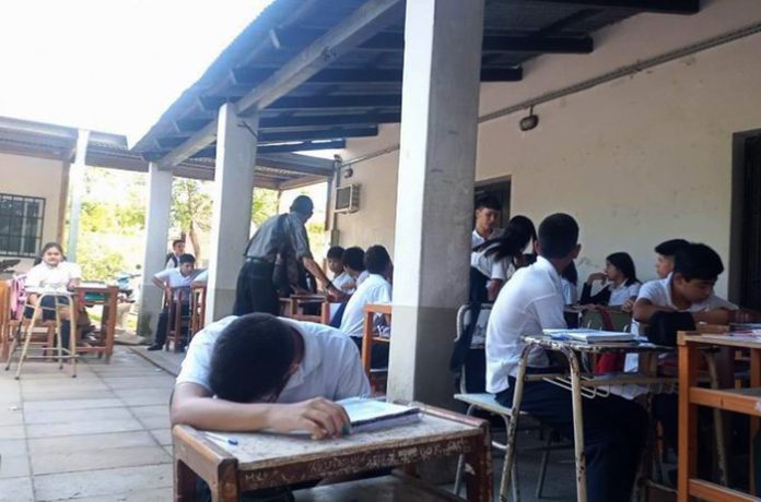 Locales | Los alumnos del Colegio Secundario Santa Rita, que funciona en la Escuela primaria N°599 'Dr. Adolfo Contte', hace dos semanas que dan clases reducidas y sacan las sillas y pupitres al patio para dar clases por falta de luz y agua. Los padres de los chicos reclaman una solución, sobre todo en estos días de mucho calor. Desde el Ministerio de Educación respondieron que están trabajando para poner en condiciones el establecimiento.