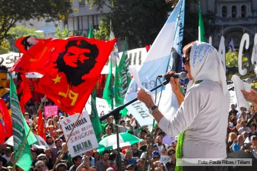 Nacionales | La dirigente de Madres de Plaza de Mayo-Linea Fundadora, Taty Almeida, afirmó que "el proyecto es claro, democracia o corporaciones", al leer parte del documento que firmaron las organizaciones que participan del acto en Plaza de Mayo.